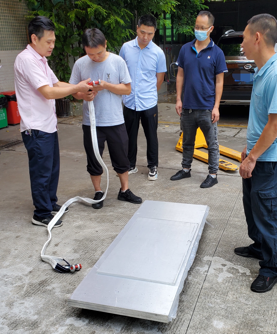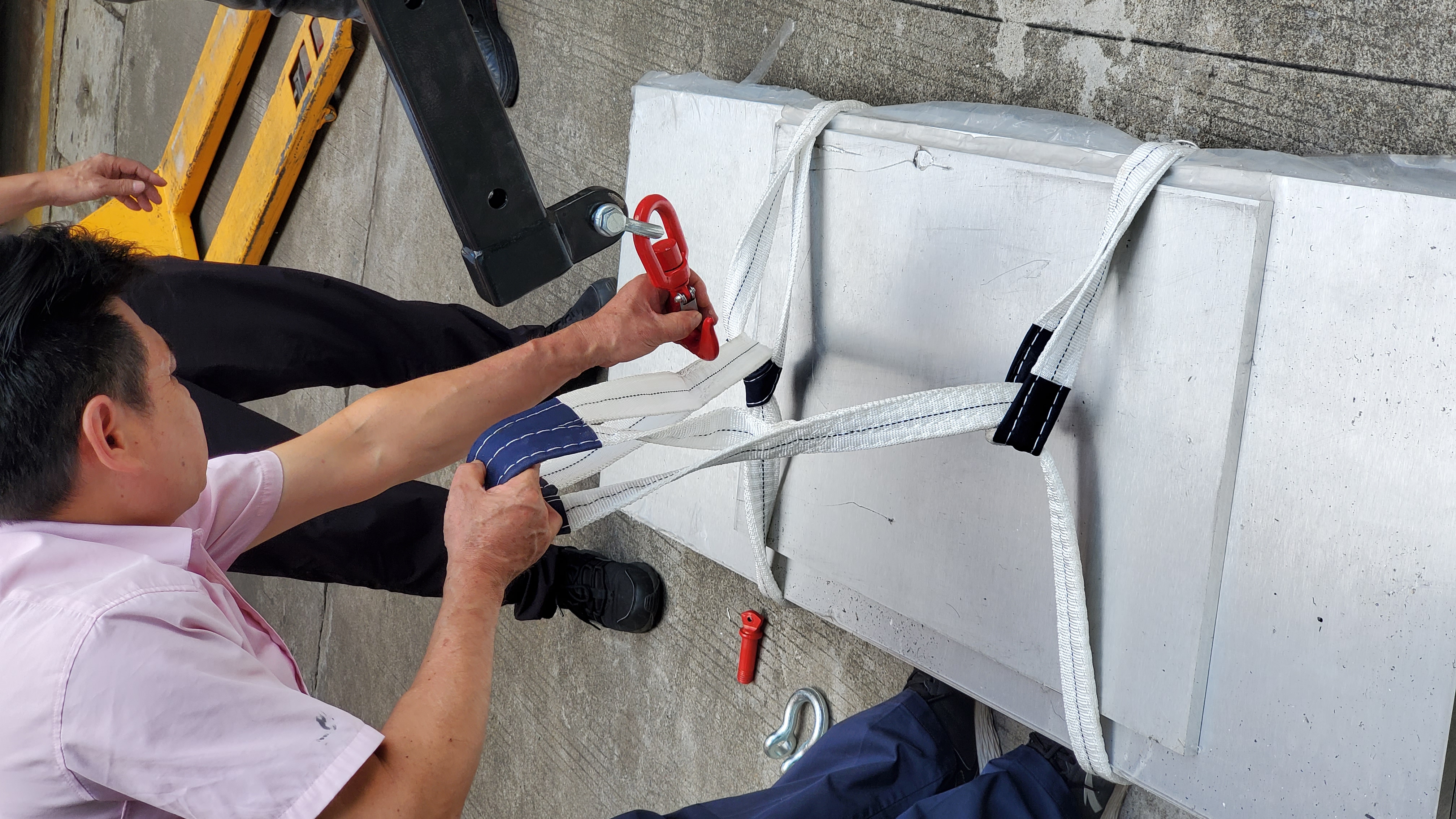 在培训开始前,刘师傅提前准备好了几块钢板,并使用绑绳和挂钩将钢板固定,保证后续的吊机操作在安全中进行。